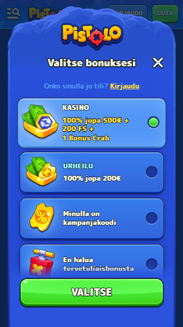Pistolo tarjoaa tyypillisesti kasinon tervetulon (100 % jopa 500 € + 200 ilmaiskierrosta + 1 Bonus Crab), viikonloppu-reloadeja, viikkospinnit sekä cashbackit – myös live-kasinoon. Kaikki voimassa olevat kampanjat, ehdot ja aikarajat: bonukset.