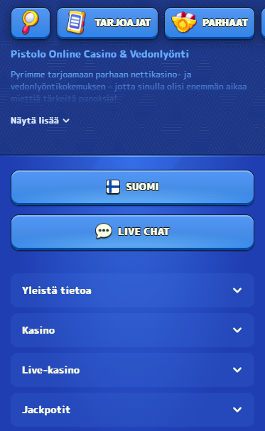 Pistolo yhdistää modernin nettikasinon ja vedonlyönnin yhdeksi nopeaksi palveluksi. Painopiste on selkeässä käyttöliittymässä, pikamaksuissa ja säännöllisissä kampanjoissa suomalaisille pelaajille.