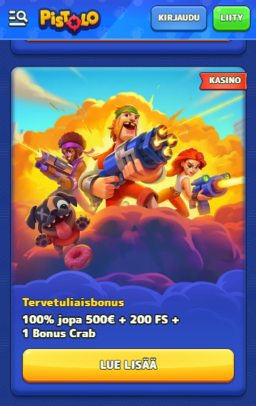 Uusille pelaajille tarjotaan usein 100 % jopa 500 € + 200 ilmaiskierrosta + 1 Bonus Crab (kasino).